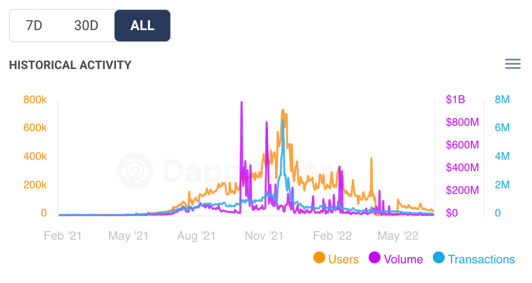 2022幎5æã®æå·é貚ã¡ãã£ã¢ã®Decryptã§ã¯ãAxieã®ã¬ããã³ã¹ããŒã¯ã³AXSãïŒ75匱â$30ãšãªã30ïŒ ä»¥äžäžèœããæé«å€$165ããã¯80ïŒ ä»¥äžã®äžèœã§ããããšãå ±ããŸããããŠãŒã¶ãŒæ°ã2022幎以éäžéããŠããŸãã
