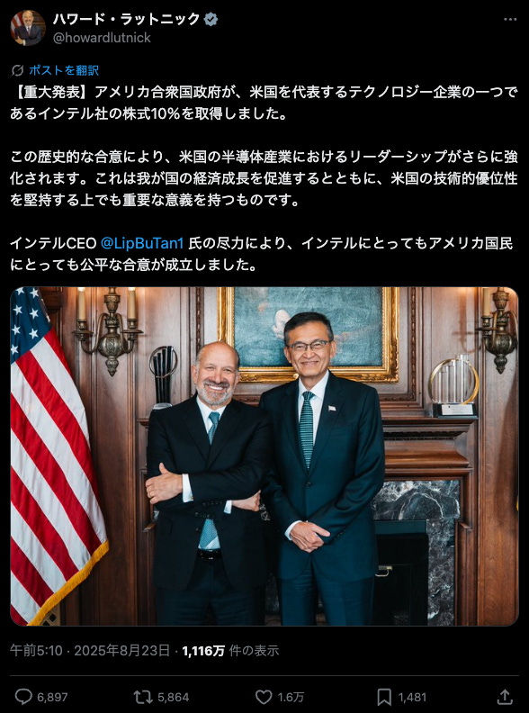 1. 米国政府、インテルに89億ドルの出資で約10%の株式を取得
