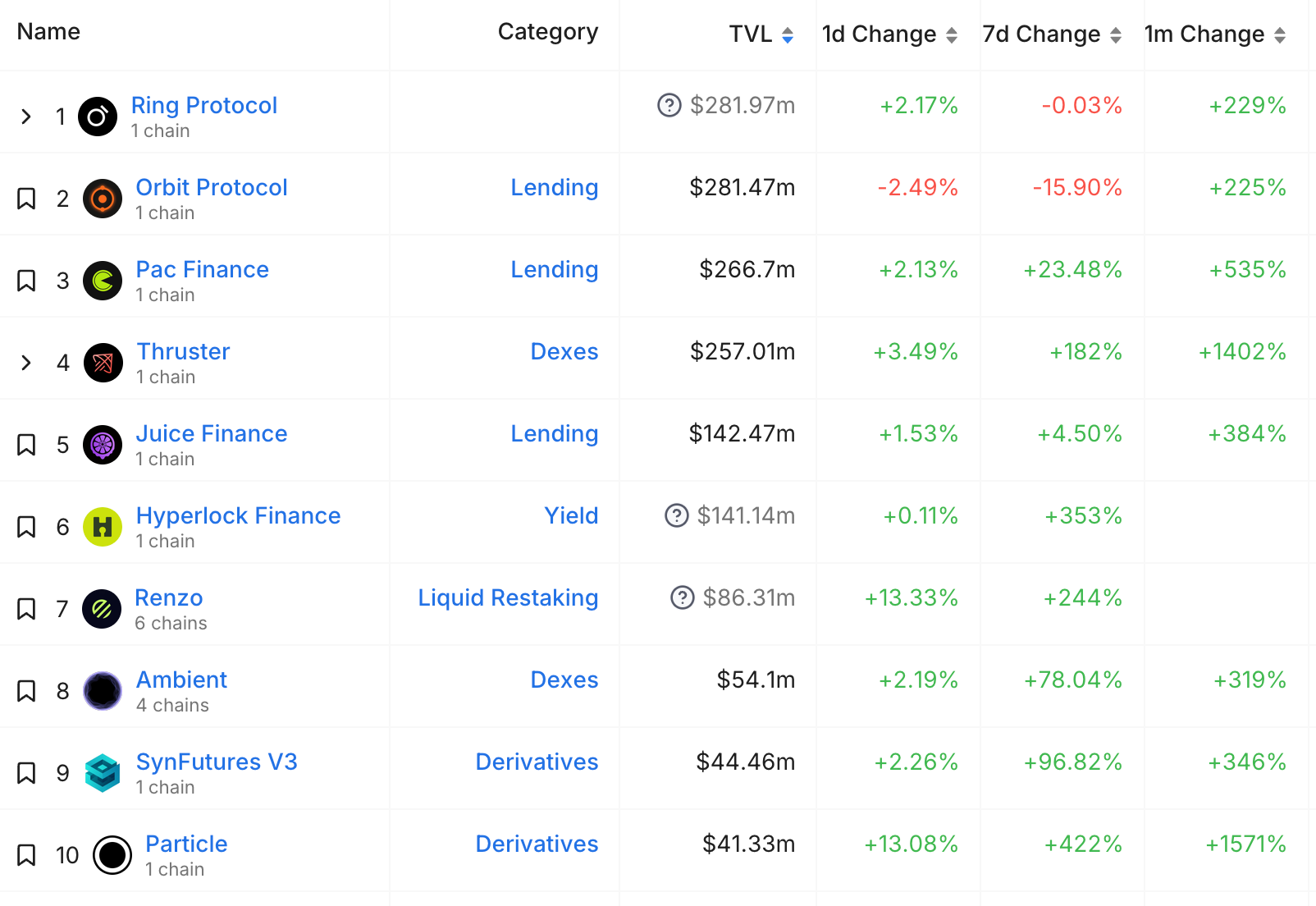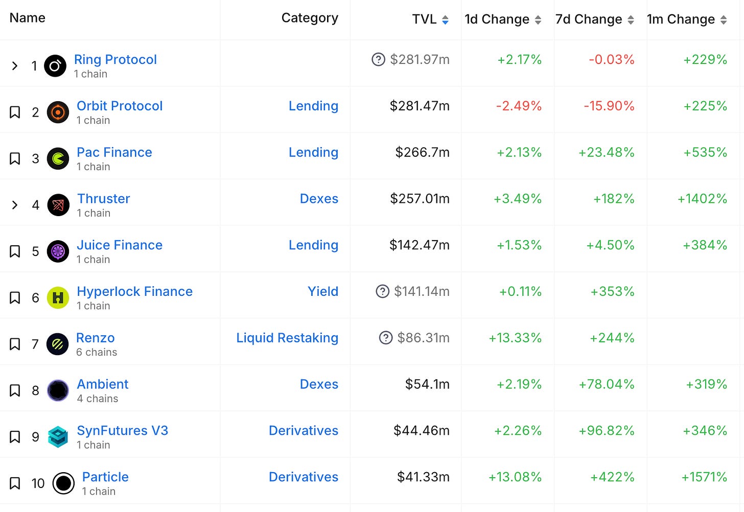Blastエコシステムは、新しいプロトコルが登場したり、盛衰のスピード感が早いです。ぼくの場合は、現状把握にはDeFiLlamaのBlastのTVLをチェックしています。ワンテンポ遅くなりますが、資金の変化でいまBlastで利用されているプロトコルを一覧で把握できます。
