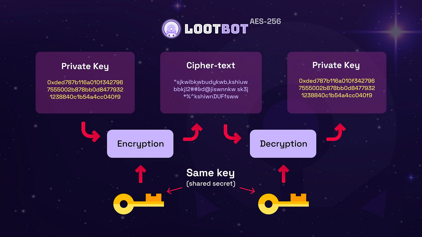 秘密鍵はAES-256方式で暗号化されて、おそらくLootBotのサーバーで記録される。秘密鍵には攻撃者やLootBotのコアチームでもアクセスできない、と説明されているがトラストポイントになることは事実。