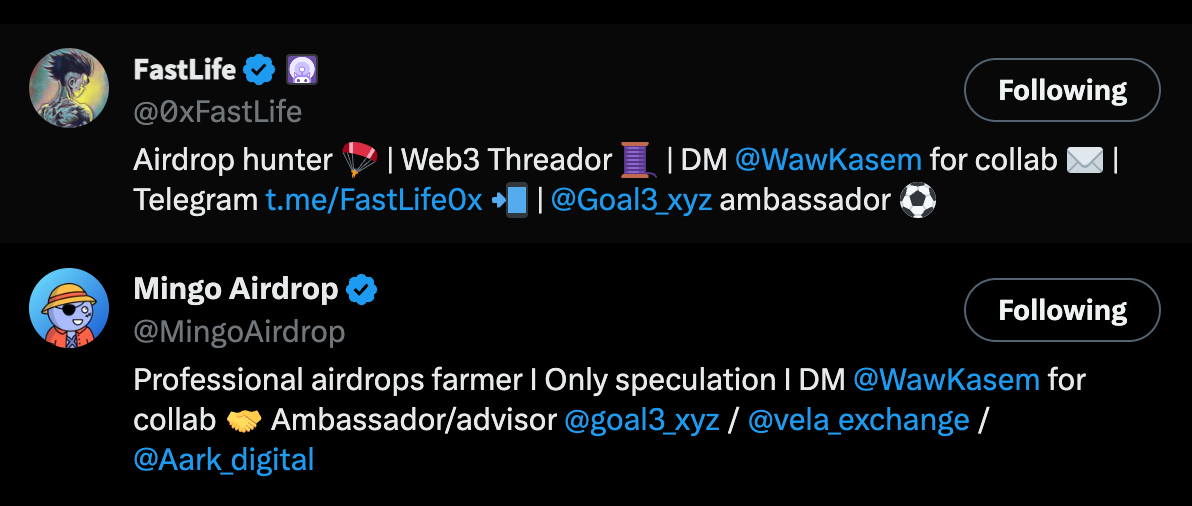 なお、エアドロップタスクの定義は、以下の2名のインフルエンサーが行っていると思われる。𝗙𝗮𝘀𝘁𝗟𝗶𝗳𝗲氏はフォロワー5.5万人、Mingo Airdrop氏は10万人。