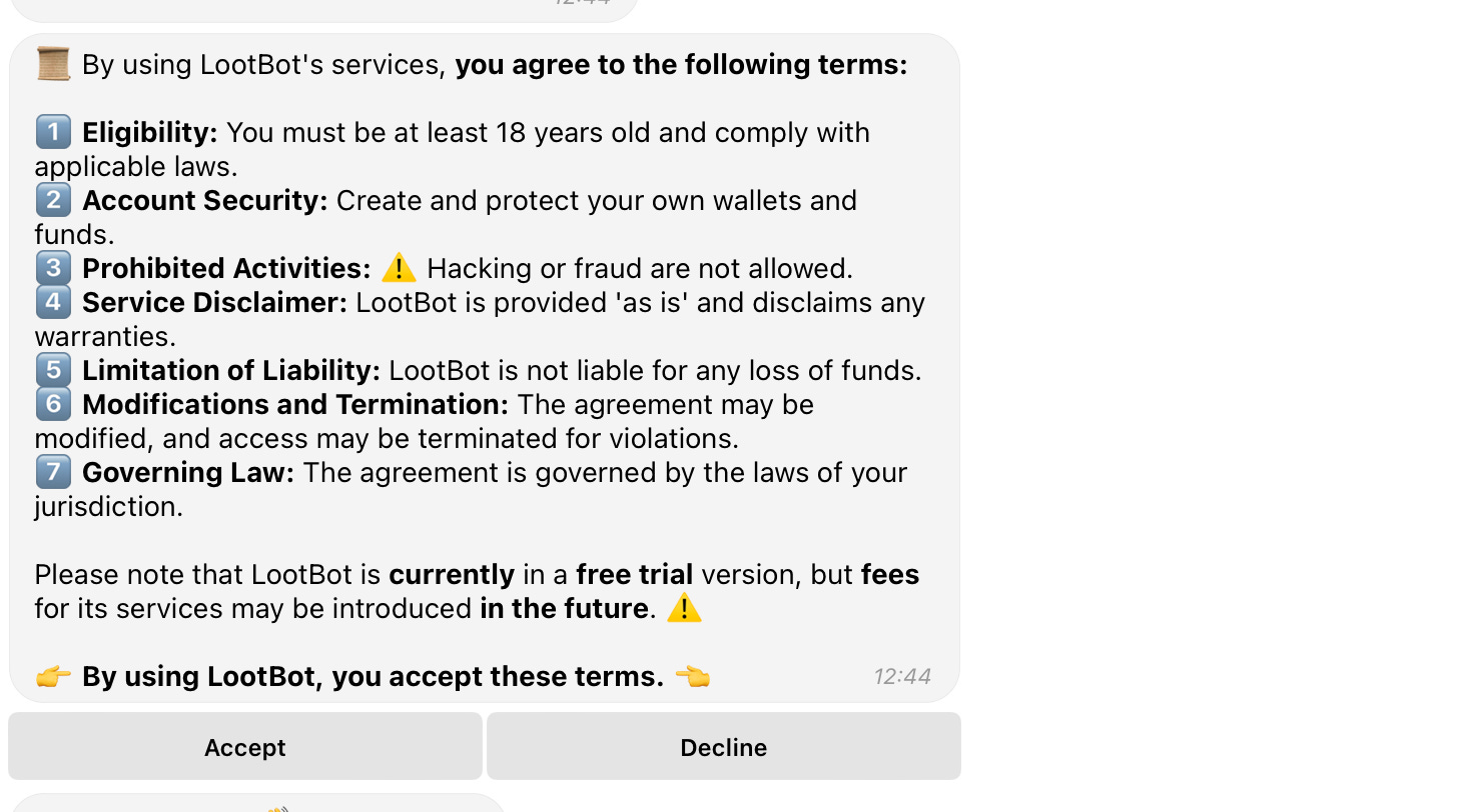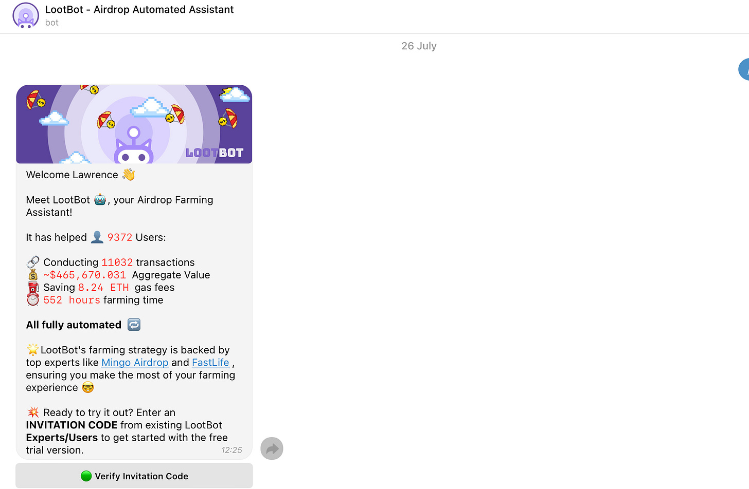LootBotの使い方は非常にシンプル。まずは、LootBotのTelegramのチャンネルにJoinする。以下のようなメッセージが送られてくる。