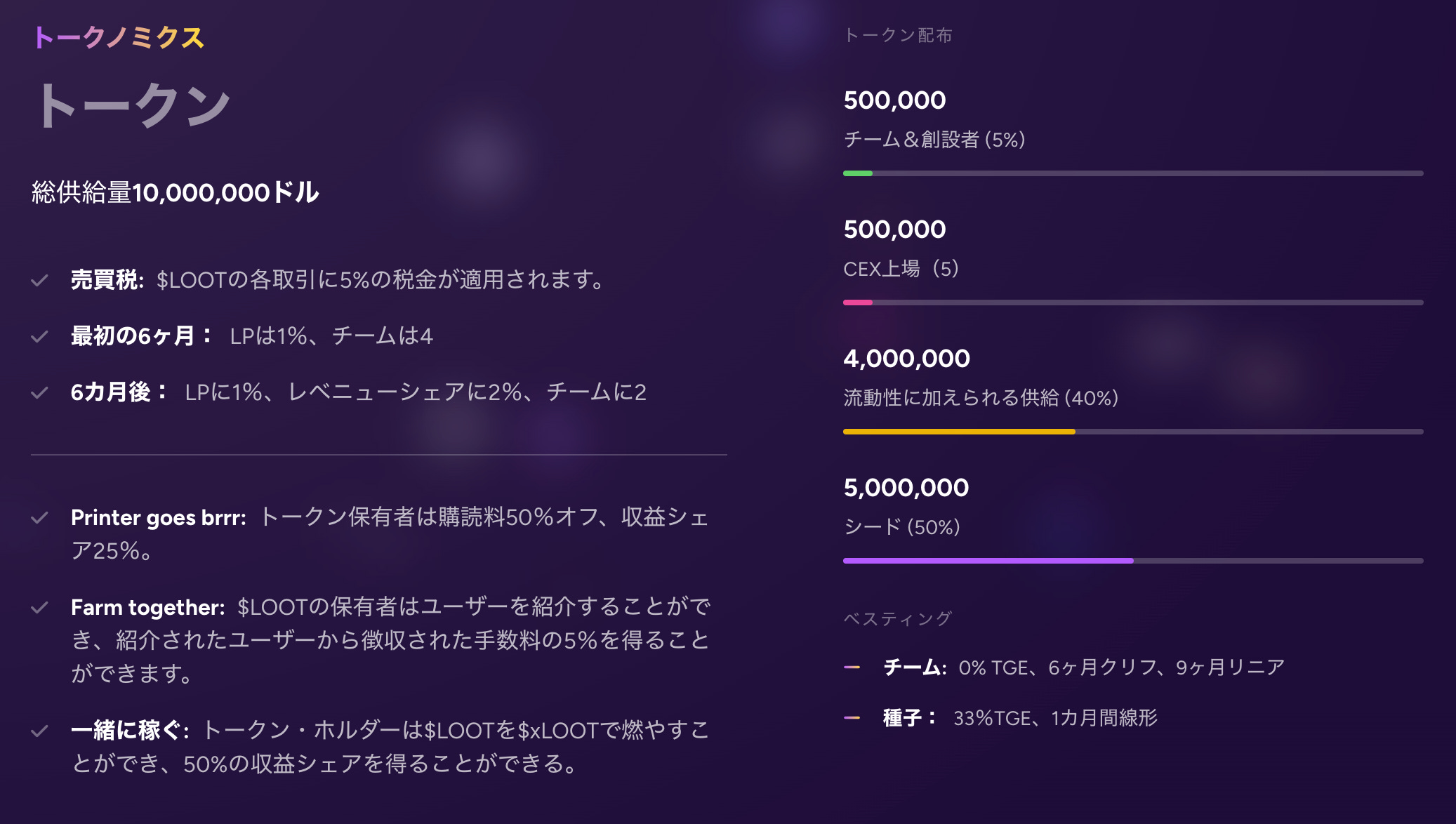 LootBotがローンチしたLOOTトークンのトークンエコノミクスは以下のとおり。レベニューシェアがあるがぼくは購入はしていない。