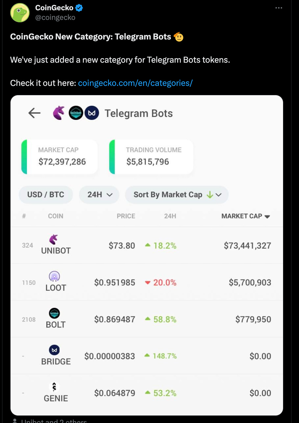 参考記事:Crypto Traders Flock to Unibot as Telegram Bot Tokens Near $100M Market Cap