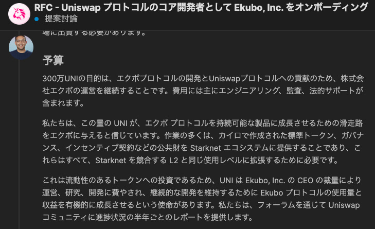 UNIトークンはEkubo Inc.のCEOの裁量により上記のコストに対して利用され、フォーラムを通じて進捗状況を半年ごとに報告するとしている。