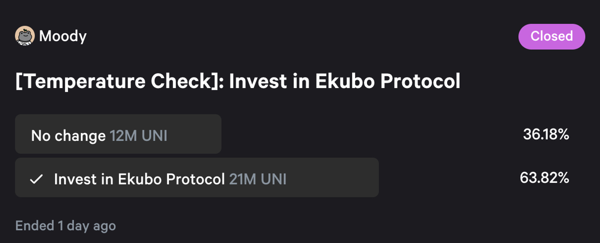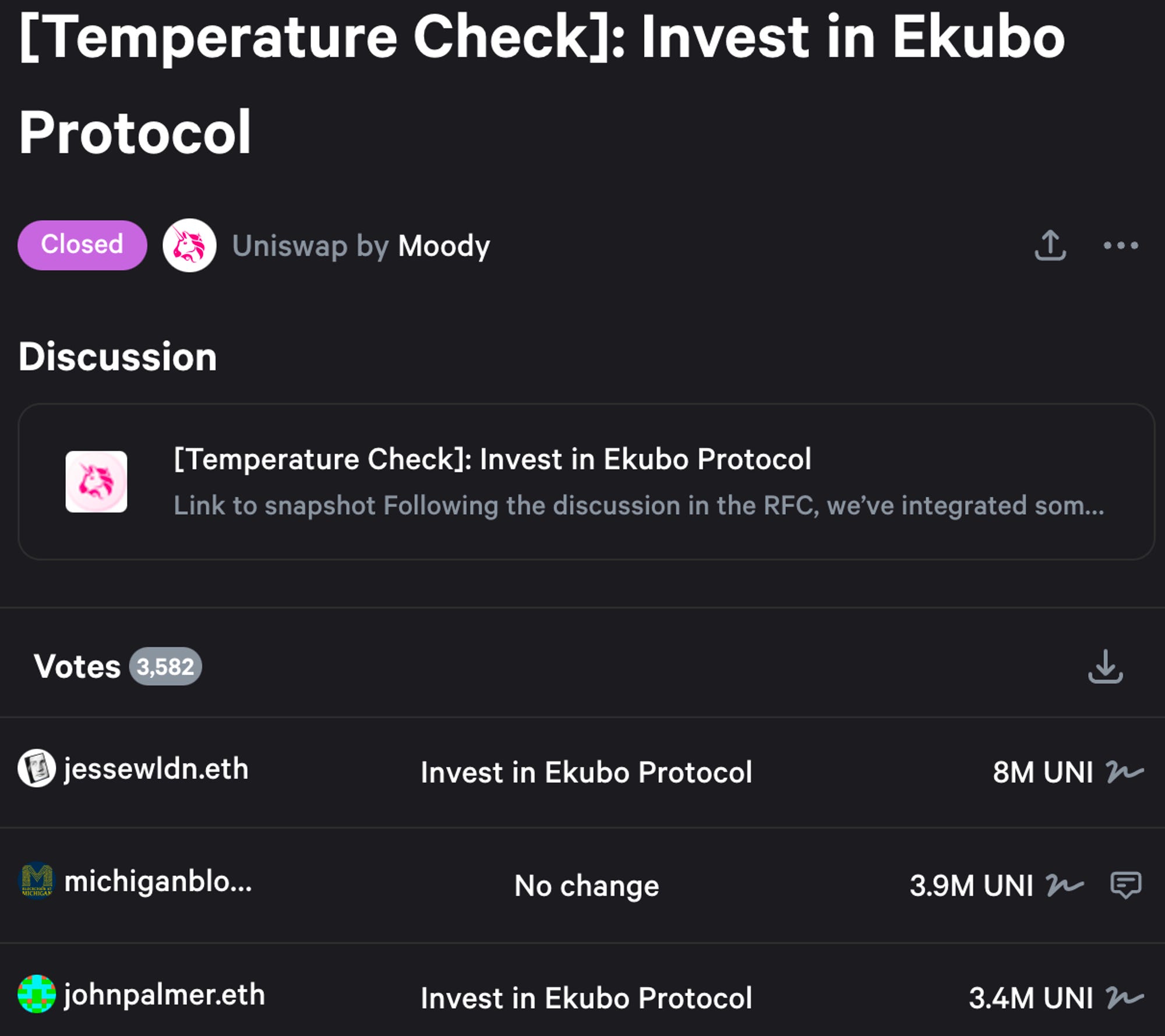 提案の概要は以上。その目的は、EkuboとUniのガバナンストークンのスワップだとも解釈できる。