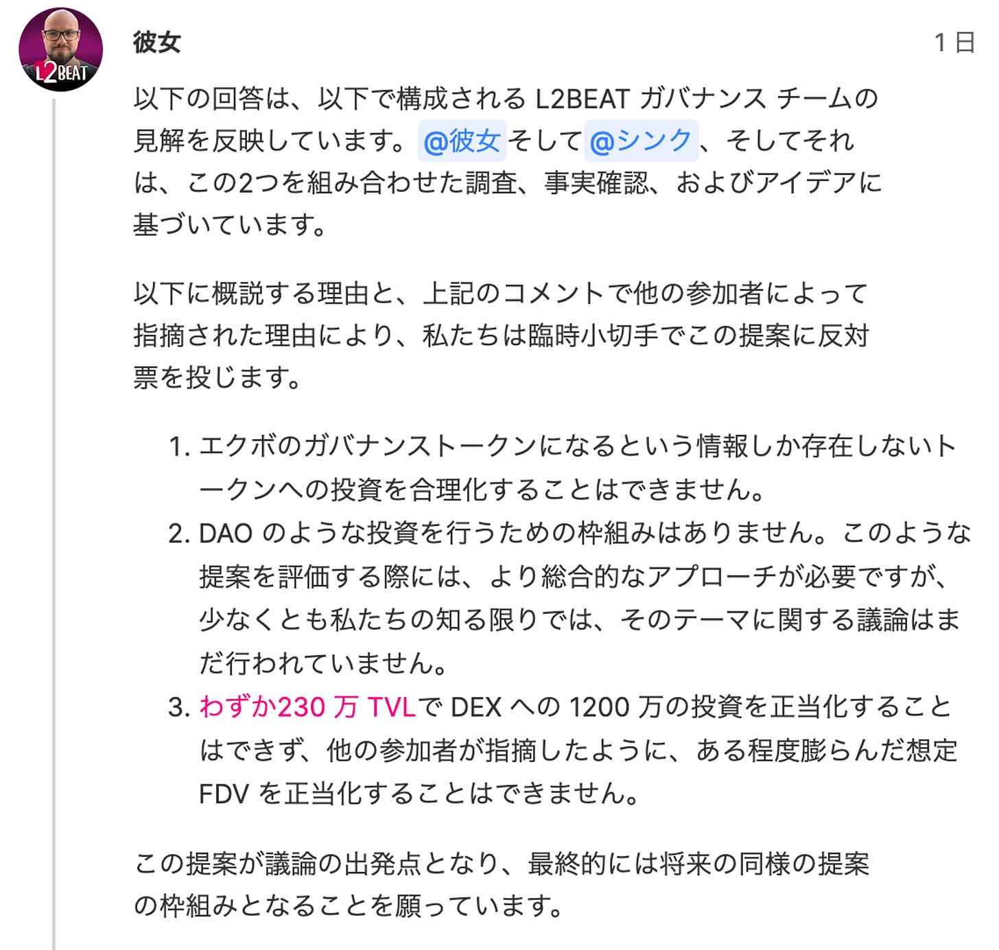 しかし、WintermuteやL2BEATが指摘しているように、300万UNIトークンという額にはもっと具体的な算出根拠とその根拠に対するUniswap DAOでの議論が必要だという点にぼくは賛成である。