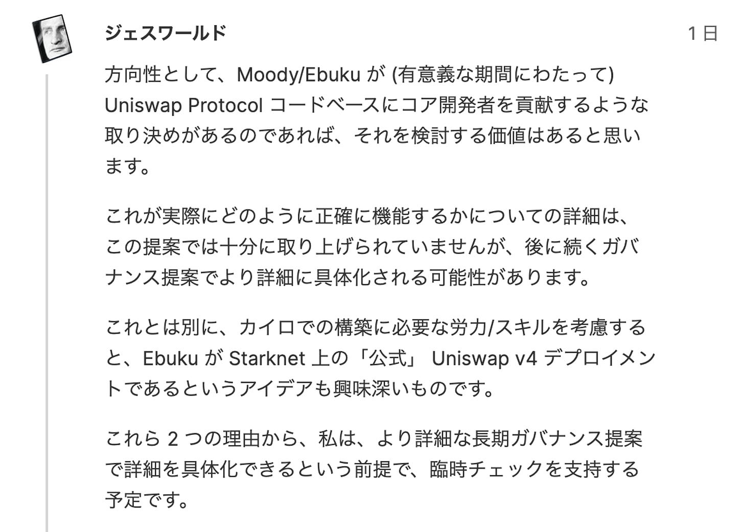 まず、UniswapがStarknetエコシステムに間接的に影響力を持つことをサポートするという意味では良い提案だと思う。