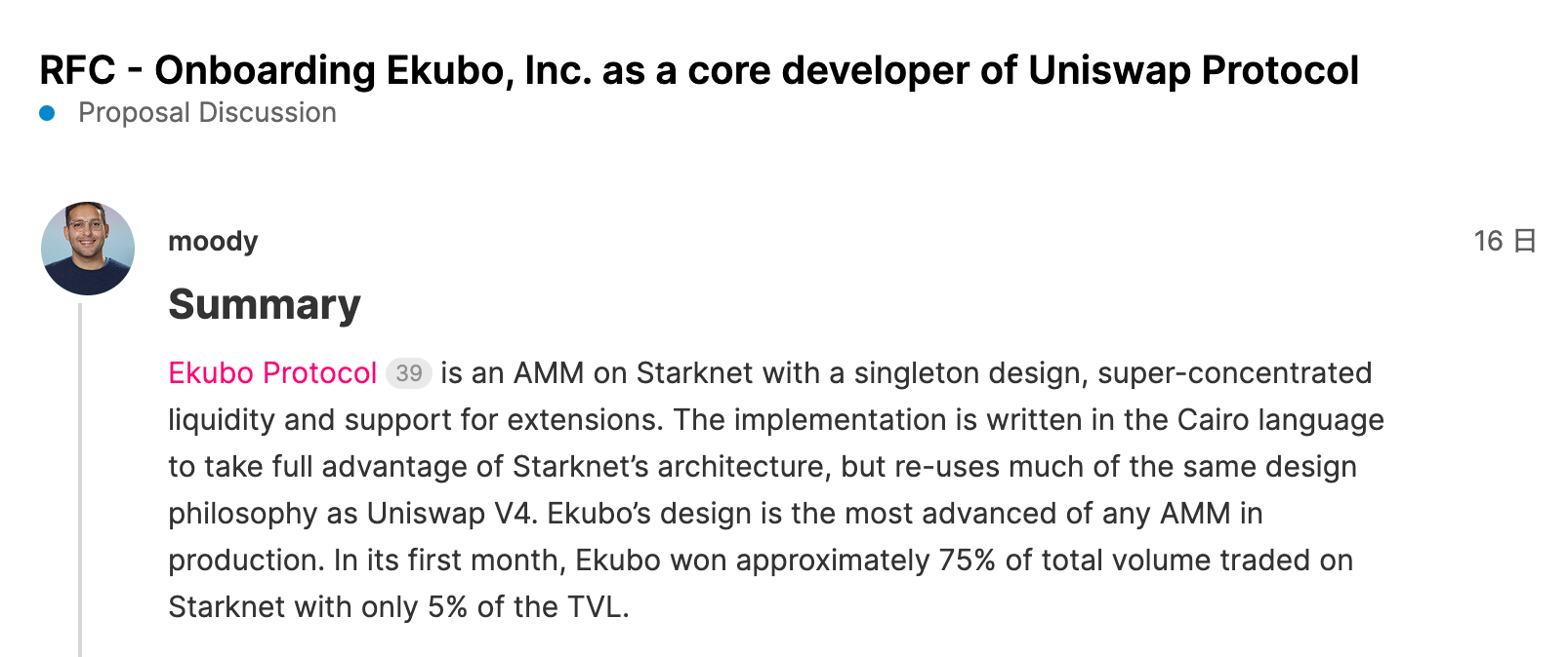 彼はフォーラムで、今回のEkuboの提案だけでは具体性がないので詳細な内容を求めている。UniswapのCairoでの構築にかかるコストを考えればEkuboがStarknet上のある意味オフィシャルなUniswap V4とするアイデアは高く評価している。