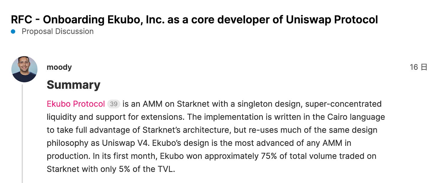 しかし、その場合EkuboからUniswapへの協力は得られないし、もし性能がEkuboがUniswapを勝るようであればStarknetでの存在感を奪われる懸念もある。Uniswap としては難しい判断だろう。