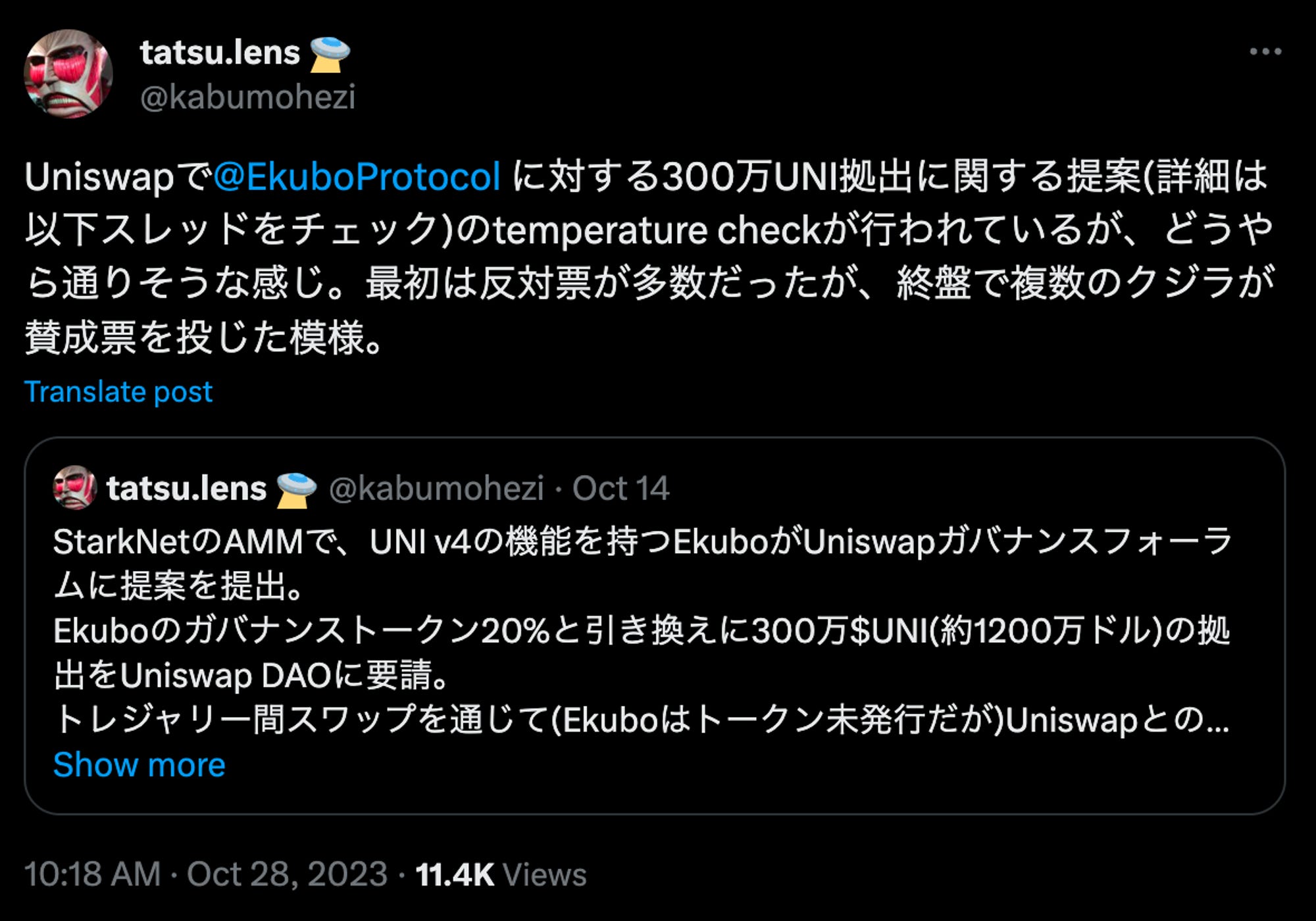 そんなEkuboは、将来のEkuboのガバナンストークンの20%と引き換えに、冒頭で説明した300万UNIの寄付をUniswap DAOに提案している。